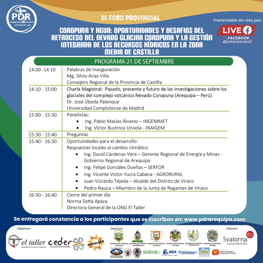 III FORO PROVINCIAL: “COROPUNA Y AGUA: OPORTUNIDADES Y DESAFIOS DEL RETROCESO DEL NEVADO GLACIAR COROPUNA Y LA GESTIÓN INTEGRADA DE LOS RECURSOS HIDRICOS EN LA ZONA MEDIA DE CASTILLA - PAMPACOLCA”