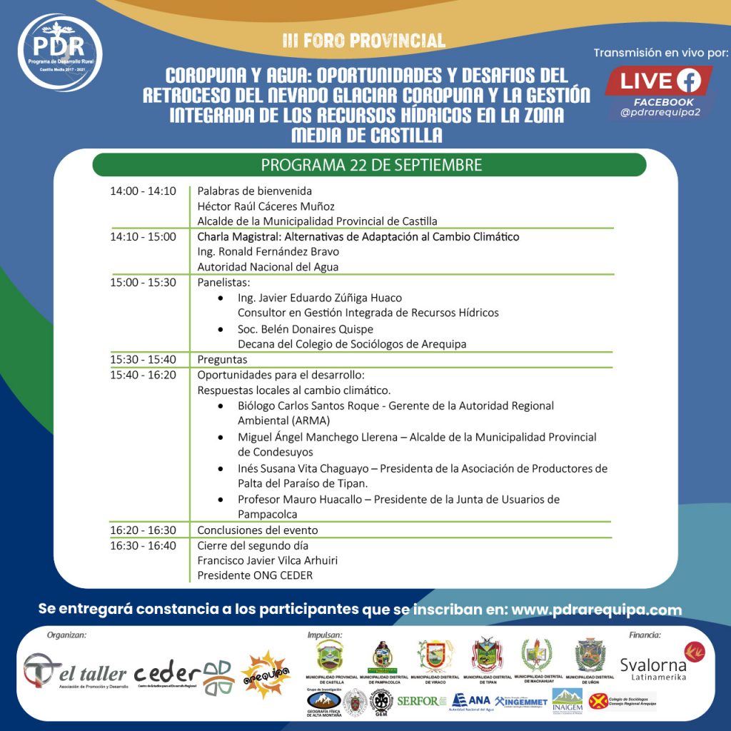 Con estos avances se propone realizar el III Foro Provincial: “COROPUNA Y AGUA: OPORTUNIDADES Y DESAFIOS DEL RETROCESO DEL NEVADO GLACIAR COROPUNA Y LA GESTIÓN INTEGRADA DE LOS RECURSOS HÍDRICOS EN LA ZONA MEDIA DE CASTILLA”, donde se dé a conocer los avances realizados a partir de los gobiernos locales y contar con información actualizada para tomar decisiones y realizar incidencia. Pero sobre todo se realizará la transferencia de la actividad a una entidad del estado para que pueda darle continuidad y sea un espacio que articule y fortalezca el desarrollo de la Región.